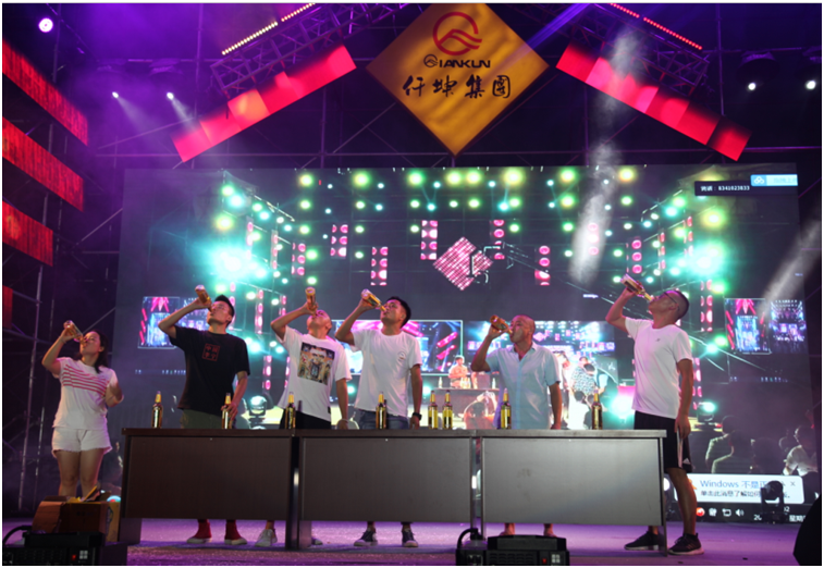 “六位啤酒一個(gè)組,兩瓶啤酒,誰(shuí)最快飲下,誰(shuí)就是冠軍!前三名獎(jiǎng)品豐厚哦。”主持人向現(xiàn)場(chǎng)觀眾介紹著啤酒大賽的規(guī)則?,F(xiàn)場(chǎng),貴州安順和綿竹兩地同時(shí)舉行啤酒節(jié),當(dāng)互動(dòng)屏幕打開(kāi)時(shí),兩地參賽者同時(shí)舉起酒瓶開(kāi)始比拼模式,雖隔著屏幕,亦能感受激烈精彩的氛圍。“加油,雄起……”臺(tái)下兩地觀眾不停地為臺(tái)上的參賽選手鼓勁、打氣。“16秒,我們的冠軍產(chǎn)生啦!啤酒大人李文僅用了8秒就喝完了一瓶750ml的啤酒,兩瓶酒16秒就喝完了,真是高手在民間啊。”伴隨著主持人宣布大賽的成績(jī),大家都舉起手中的酒杯,為冠軍喝彩。被盛邀參加啤酒節(jié)的貴州安順人楊昌倫表示,仟坤集團(tuán)特意邀請(qǐng)了貴州安順的業(yè)主和表演團(tuán)隊(duì)來(lái)到綿竹,兩地同時(shí)舉行啤酒節(jié),現(xiàn)場(chǎng)互動(dòng),既豐富了本地的文化生活,又吸引了很多外地朋友,讓更多的人了解仟坤,仟坤有實(shí)力,作為業(yè)主感到自豪。