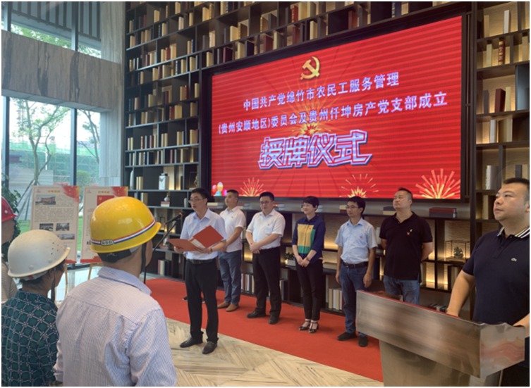 6月21日上午,中國共產(chǎn)黨綿竹市農(nóng)民工服務管理(貴州安順地區(qū))委員會及貴州仟坤房產(chǎn)黨支部成立授牌儀式在貴州安順仟坤.天朗售房中心隆重舉行。綿竹市市委常委、組織部部長李偉,貴州安順經(jīng)開區(qū)黨工委委員、紀工委書記雷珺茗,綿竹市高新區(qū)黨工委委員、紀工委書記馮曉敏,仟坤集團總裁謝澤波,仟坤集團黨委書記、副總裁周述軍,仟坤集團黨建指導員劉佩章,貴州安順仟坤房產(chǎn)總經(jīng)理、黨支部書記秦永明出席儀式。本次授牌、揭牌儀式由仟坤集團總裁謝澤波主持。