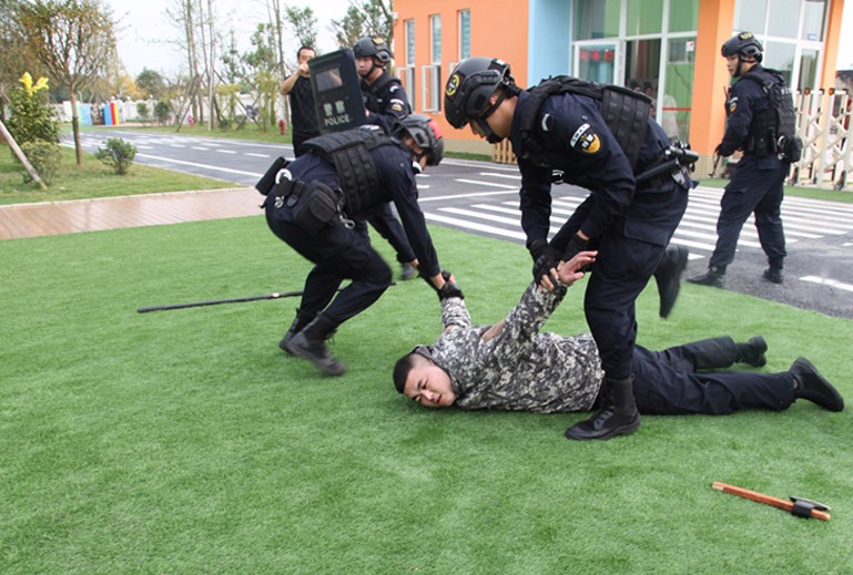 隨即,幼兒園保安和特巡警員共同進(jìn)行了恐怖襲擊場景模擬。忽然,一名持斧頭的男子試圖闖進(jìn)幼兒園來,大聲嚷嚷著要報復(fù),還拿著斧頭四處揮舞,危險一觸即發(fā)。一鍵報警的東北派出所警車呼嘯趕到,全副武裝的民警果斷出擊,經(jīng)過一番搏斗將"歹徒"成功制服,將其押上了警車。